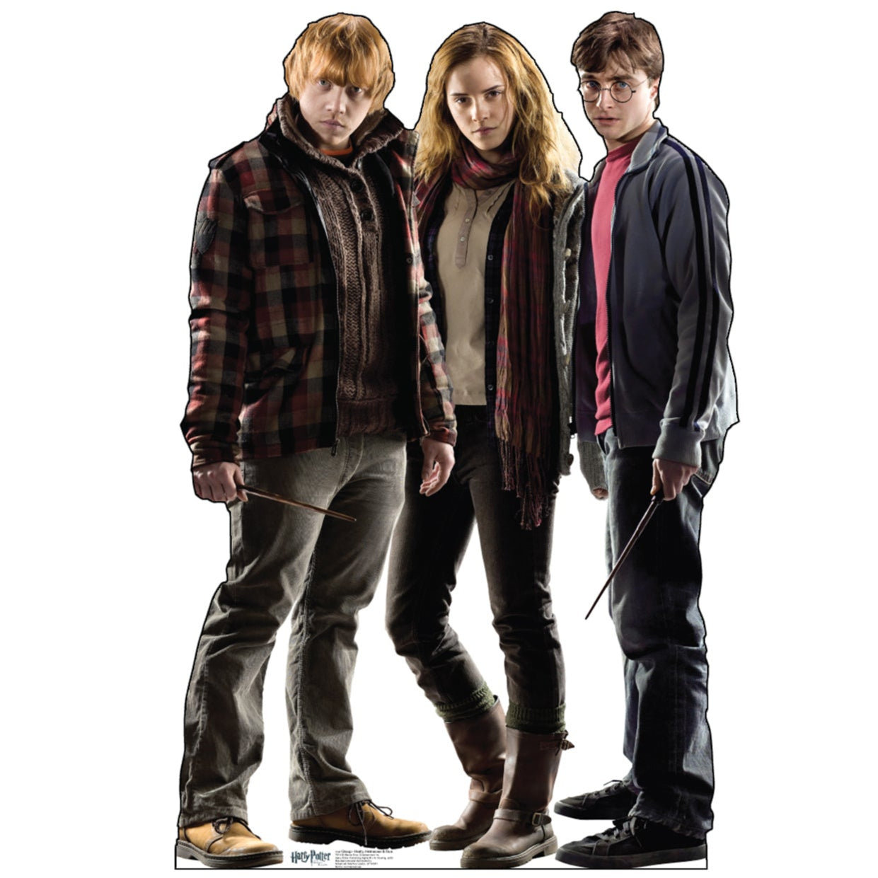 Bring the heart and magic of Hogwarts into your world with this life-size cardboard cutout of Harry Potter (Daniel Radcliffe), Ron Weasley (Rupert Grint), and Hermione Granger (Emma Watson) from the Wizarding World of Harry Potter. Measuring 56" x 37", this high-quality, single-sided print on durable cardboard includes an easel back for easy, freestanding setup.